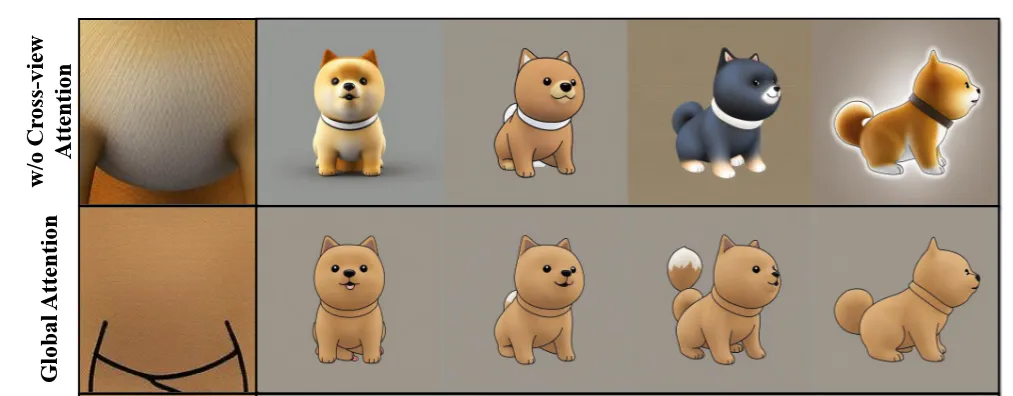 Cross-attention을 진행하게 되면 아래 사진처럼 확실히 이전에 비해서 뷰끼리의 consistency가 일치하는 것을 확인할 수 있습니다. 하지만 여기서의 문제는 texture가 단조로워진 다는 것입니다. 뷰끼리 일치시키려다 보니까 color diversity와 local details를 감소시킵니다. 가장 큰 이유는 cross-attention을 통한 분산 감소입니다. 어느 각도에서 보느냐에 따라서 light, highlight가 달라질 수 있지만, cross-attention을 통해서 이를 일치시켜서 texture가 단조로워집니다.