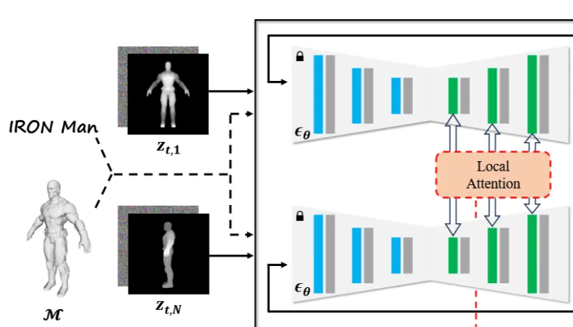 많은 3D representation과 texture 논문에서도 U-Net의 Self-attention 부분을 다른 view와의 cross-attention으로 바꾸고 해당 논문에서도 진행했습니다.