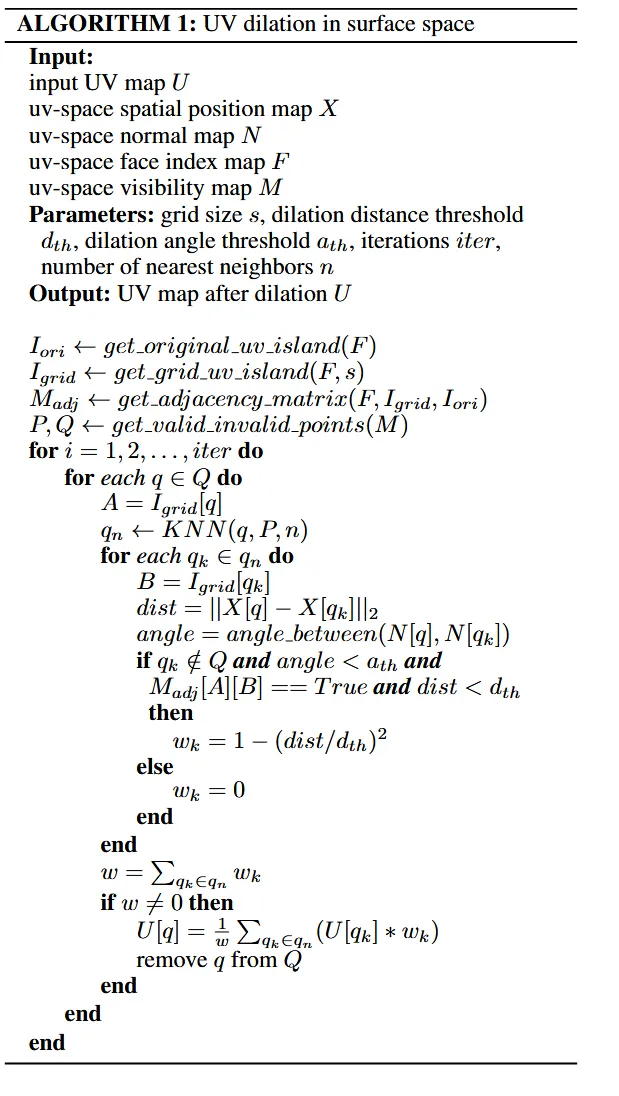 이후 우리가 보이지 않는 영역에 대해서 3D 거리가 인접한 부분, normal vector가 비슷한 부분, 이전에 계산한 adjancey matrix로 인접한 부분 3개의 부분에 대한 weighted averge로 해당 픽셀 값을 선택합니다. 자세한 내용은 위의 알고리즘을 참조하시면 됩니다.