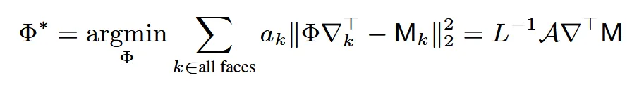 각 face마다 변형 행렬 를 정의하고, 전체 메시 정점을 최적으로 변형시키는 를 구해야 하는데 이는 위의 수식처럼 포아송 방정식으로 풀 수 있습니다. 는 면의 면적, 는 gradient을 나타냅니다. 위의 수식은 미분 가능하므로 backpropagation에서도 문제 없이 활용할 수 있습니다.dARAP도 포아송 방정식으로 표현할 수 있기 때문에 NJF처럼 미분 가능한 solver를 활용할 수 있습니다.