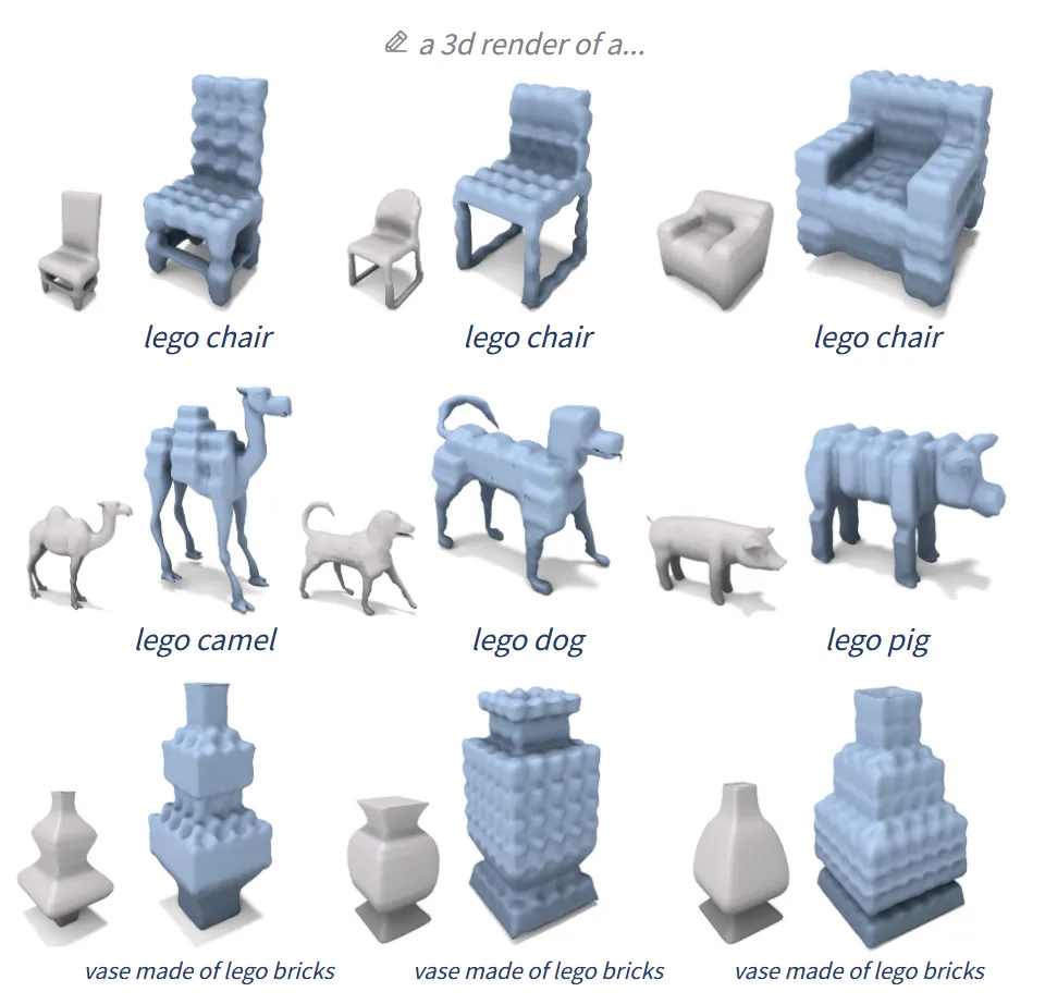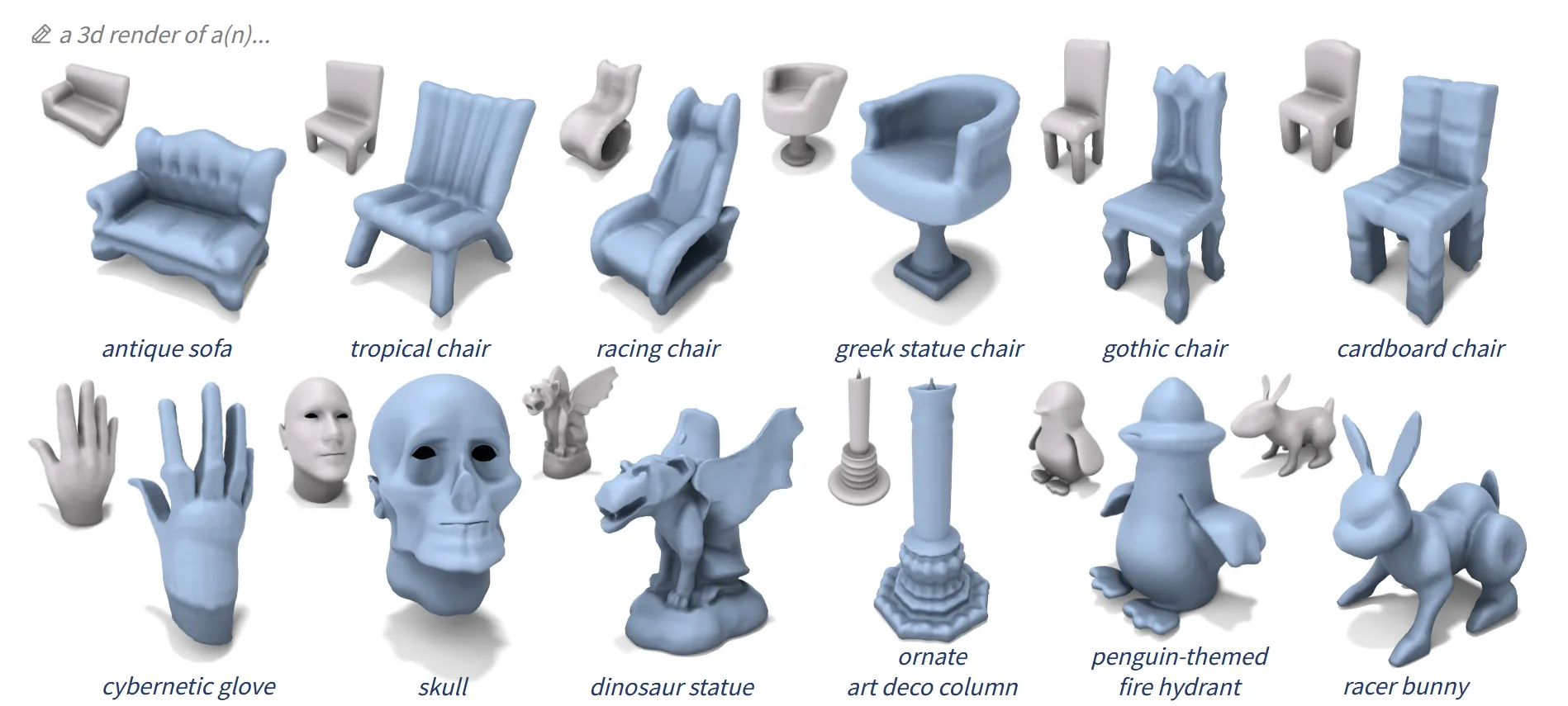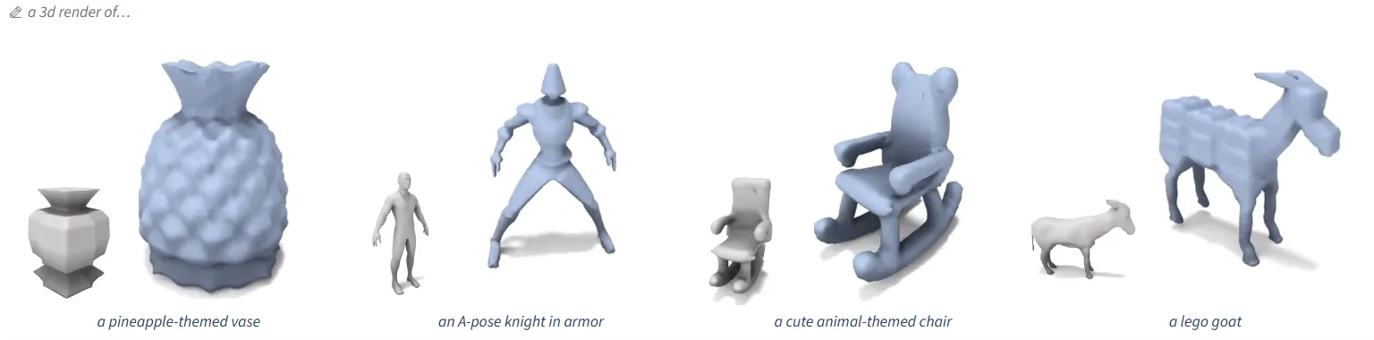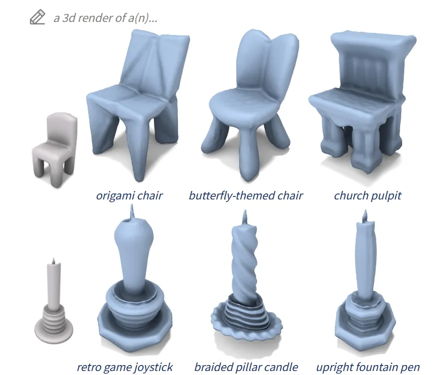 Text에서 지시한 세부 스타일을 실제 mesh 구조에 아주 구체적으로 반영할 수 있습니다. 예를들어서 왼쪽 위의 결과에서 종이 접기 스타일의 text를 반영하기 위해서 접힌 자국처럼 보이는 주름이 표현된 것을 확인할 수 있습니다.