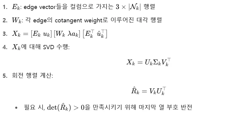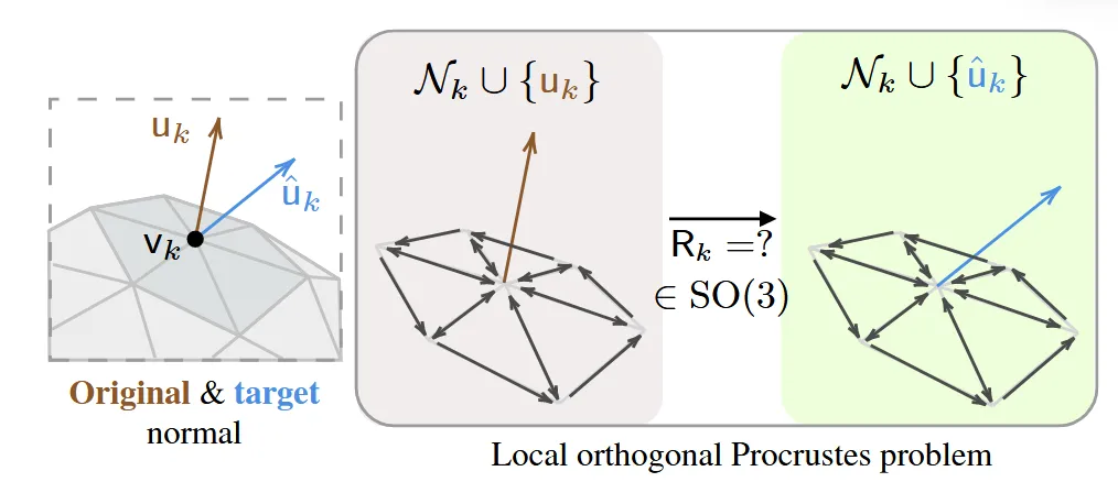 핵심 아이디어는 vertex들의 normal vector를 먼저 최적화 하는 것입니다. Mesh에 개의 vertices가 있다고 할 때 gradient descent는 을 직접 optimize해서 target normal vector 를 얻습니다. 이후 각 정점의 rotation 을 얻기 위해 가 사용됩니다. 마지막으로 rotation matrix를 vertex position에 반영하는 과정을 진행합니다.