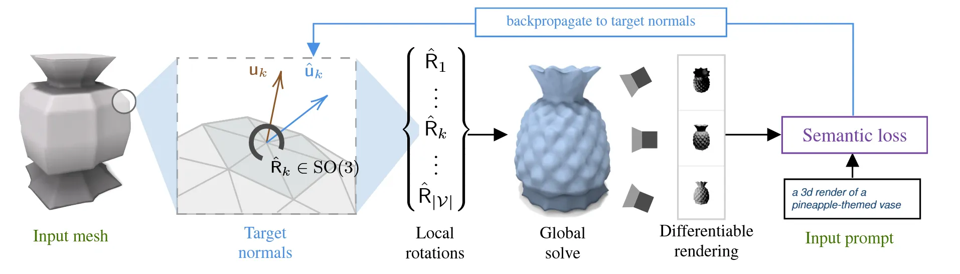 최근에는 생성뿐만 아니라 Text를 기반으로 3D를 수정하는 방법들도 제시 되고 있습니다. 해당 논문도 Text를 기반으로 3D를 수정하지만 기존 논문들은 단순히 mesh의 vertex 위치를 직접 옮기는(displacement) 방식이지만 해당 논문은 표면의 법선을 회전시키는 간접적인 방식으로 mesh를 변형하고, 결과는 dARAP solver로 계산합니다.