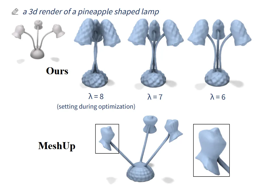 어떤 스타일 변형에서는 mesh의 일부가 자기 자신과 겹치는 현상(self-intersection)이 생길 수 있습니다. 위의 그림을 보면 램프의 막대들이 중심을 향해 회전하면서 서로 관통해버렸습니다. 이럴 때는 λ값을 유동적으로 변경하면 됩니다.
