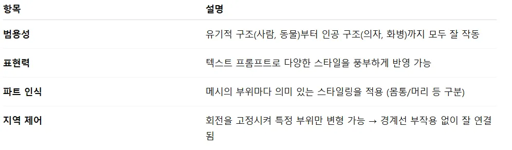 원래 Mesh의 고유한 형태, 포즈, 구조를 훼손하지 않고 유지할 수 있습니다. 이는 normal 기반 rotation matrix를 사용했기 때문에 정체성을 유지하면서 부분적인 변형이 가능한 것입니다.