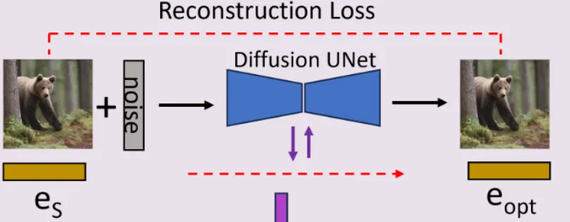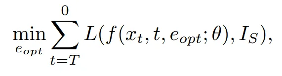 수식은 위와 같습니다. L은 DDPM의 loss function이므로 쉽게 말해서 원본 이미지 IS를 잘 설명하는 임베딩 eopt를 생성하는 과정입니다.