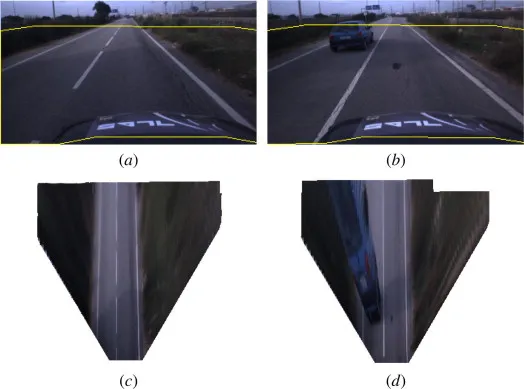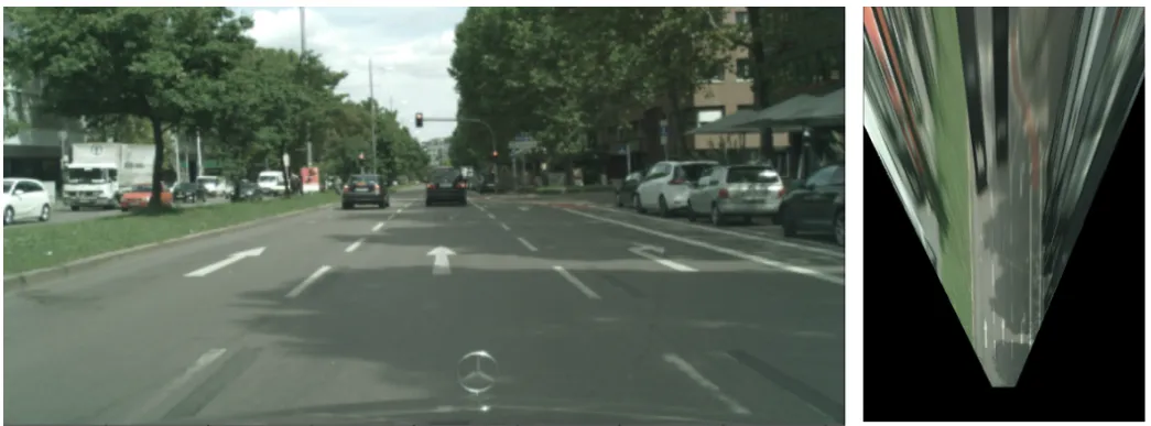 Inverse perspective mapping (IPM) 방식은 자율주행에서 많이 사용되는데 위와 같이 입력 이미지를 넣고 IPM 방식을 적용하면 위에서 보이는 것처럼 사진이 변합니다.