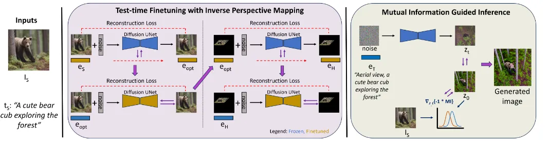 해당 모델은 입력 이미지와 text prompt가 들어가면, 해당 이미지를 항공 뷰의 시점으로 바꿔주는 모델입니다. 3D 데이터나, 3D 모델을 활용하지 않고 결과를 냈다는 점에서 주목해볼만 합니다.