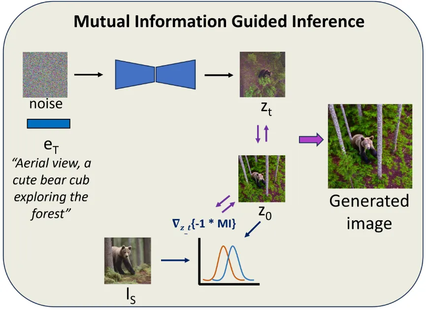 이렇게 우리는 항공뷰를 생성하는데 최적화된 임베딩과 Diffusion Unet 모델을 얻었습니다. 이를 기반으로 이미지를 생성할 경우 항공뷰의 이미지가 나오긴 하지만 원본 이미지와는 다른 결과가 나올 수 있습니다. 따라서 원본 이미지와 유사하게 학습하도록 Mutual information을 사용했습니다.