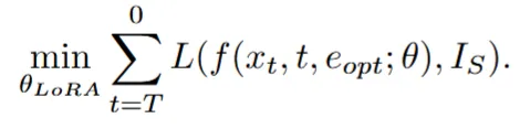 수식을 보면 이전 수식과 비슷한데 이전에는 업데이트 하는 값이 단순히 값 eopt였다면 이번에는 Diffusion Unet에 추가한 LoRA layer의 가중치입니다.