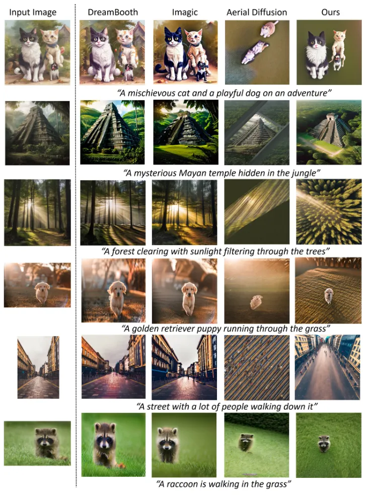 DreamBooth나 Imagic 같은 방식은 fine-tuning을 통해서 앉아있는 개를 서있게 하거나, 개를 애펠타워 앞에 있게 할 수 있습니다. 이러한 방식을 항공뷰(aerial view)에 적용할 경우 많은 변화를 줄 수 없습니다. 왜냐하면 이미지에 맞게 fine-tuning을 진행하면 overfitting이 심해진다고 합니다. 따라서 논문에서는 4개의 step을 통해서 충분한 변형을 가할 수 있도록 모델을 설계 했습니다.