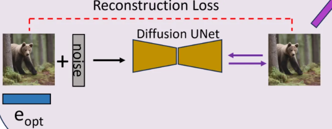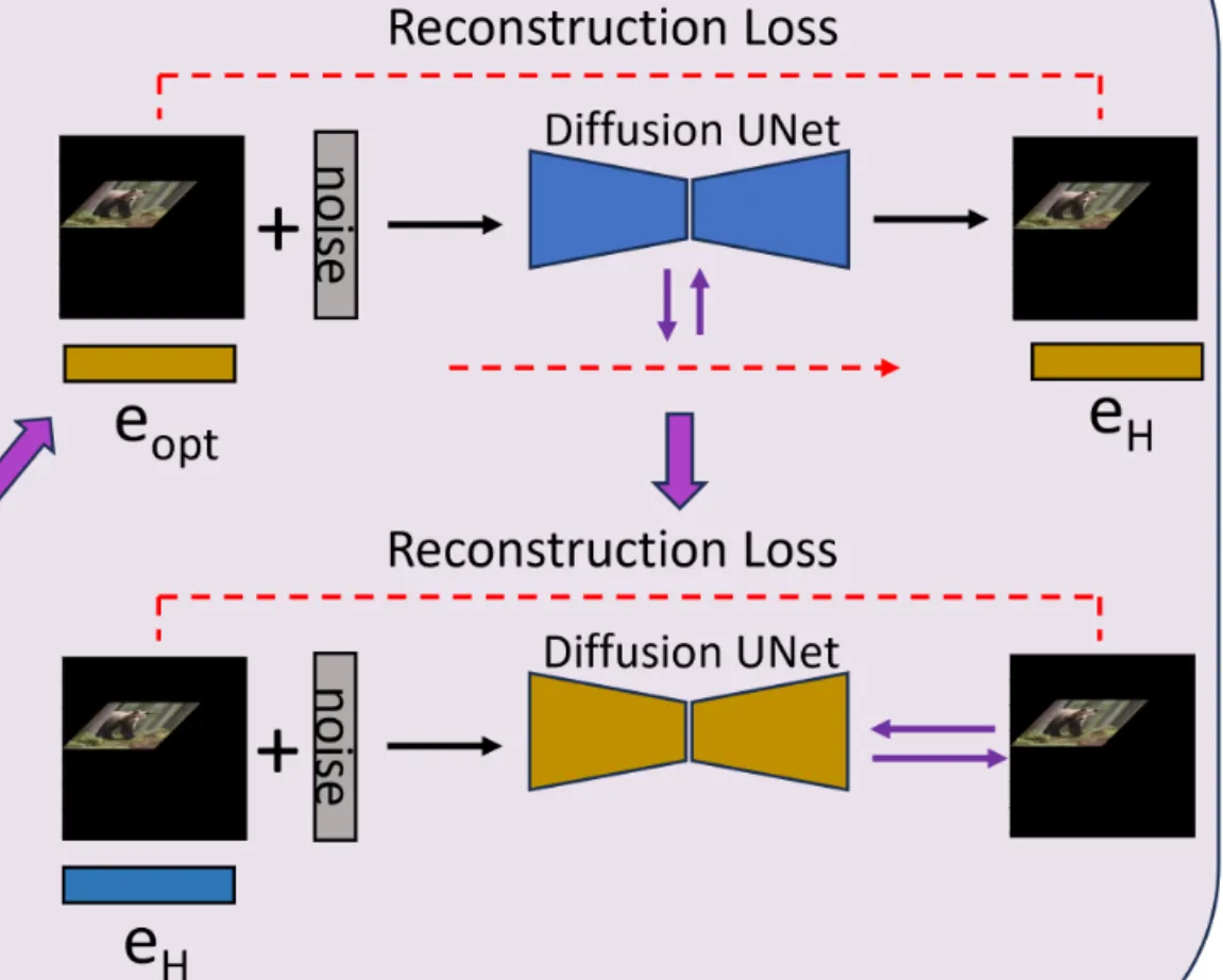 두번째 단계는 방금 생성한 eopt를 이용해서 원본 이미지를 reconstruction을 잘하게 하는 과정입니다. 이때 사용하는 Diffusion UNet에 LoRA layer를 추가해서 θLoRA 파라미터만 학습하도록 합니다.