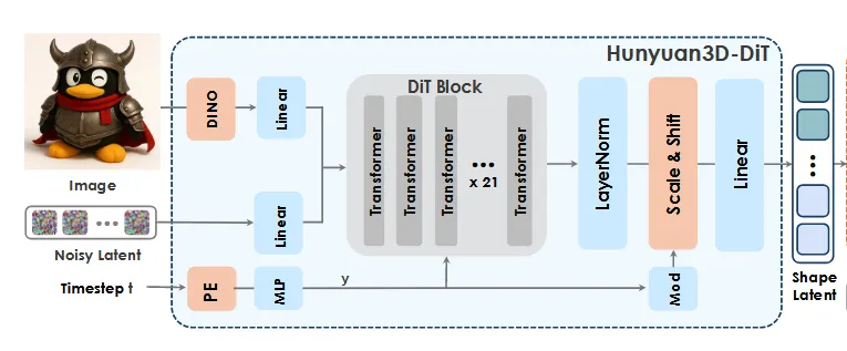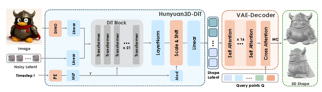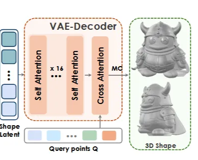 3D 데이터를 latent space로 압축시키고 이를 다시 decoder로 3D 데이터로 복원하는 Hunyuan3D-ShapeVAE와 condition을 기반으로 VAE에서 생성한 latent처럼 생성하는 diffusion 모델인 Hunyuan3D-DiT로 이루어져 있습니다. 여기까지는 2.0 버전이랑 비슷한데 각 모델이 어떻게 2.1에서는 바뀌는지 확인해보도록 하겠습니다.
