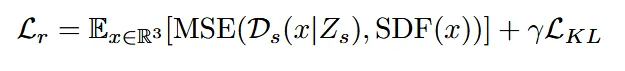 loss도 기존과 동일하게 SDF끼리 비교하는 MSE loss와 latent끼리 비교하는 KL divergence loss를 사용합니다.