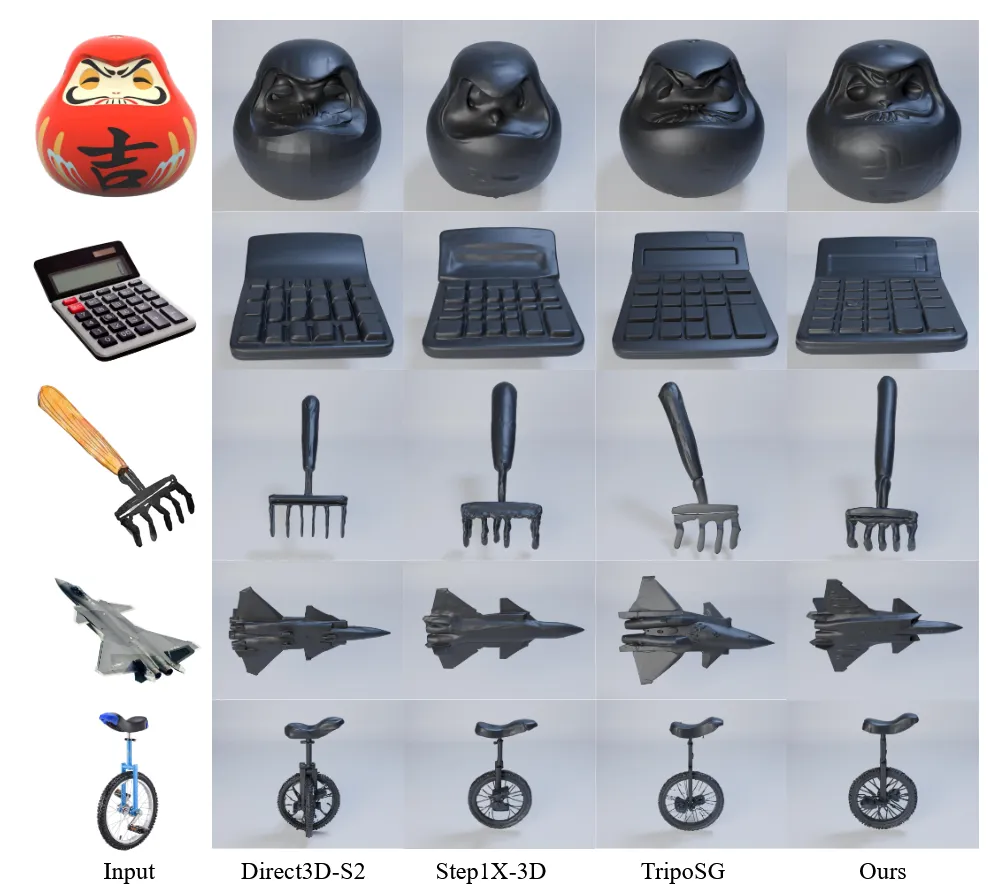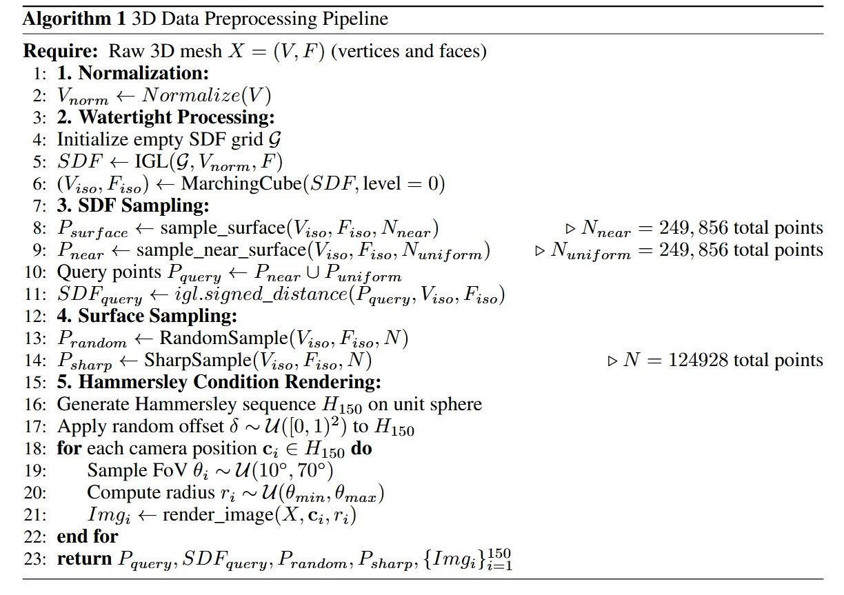 3D latent는 3DShape2VecSet이라는 기술과 Dora에서 사용한 벡터 집합 방식을 이용해 3D 형태를 표현합니다. 아래에서 정확히 다루겠지만 현재 입력으로 기존 3D Position(위치)와 함께 normal vector를 갖는다고 설명되어 있습니다. Decoder는 이전처럼 SDF를 예측하고 이를 기반으로 Mesh를 생성하도록 설계 됐습니다.