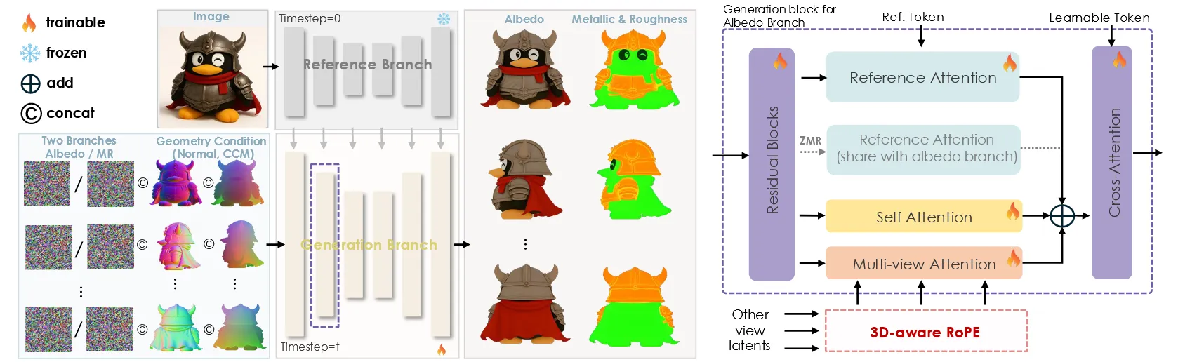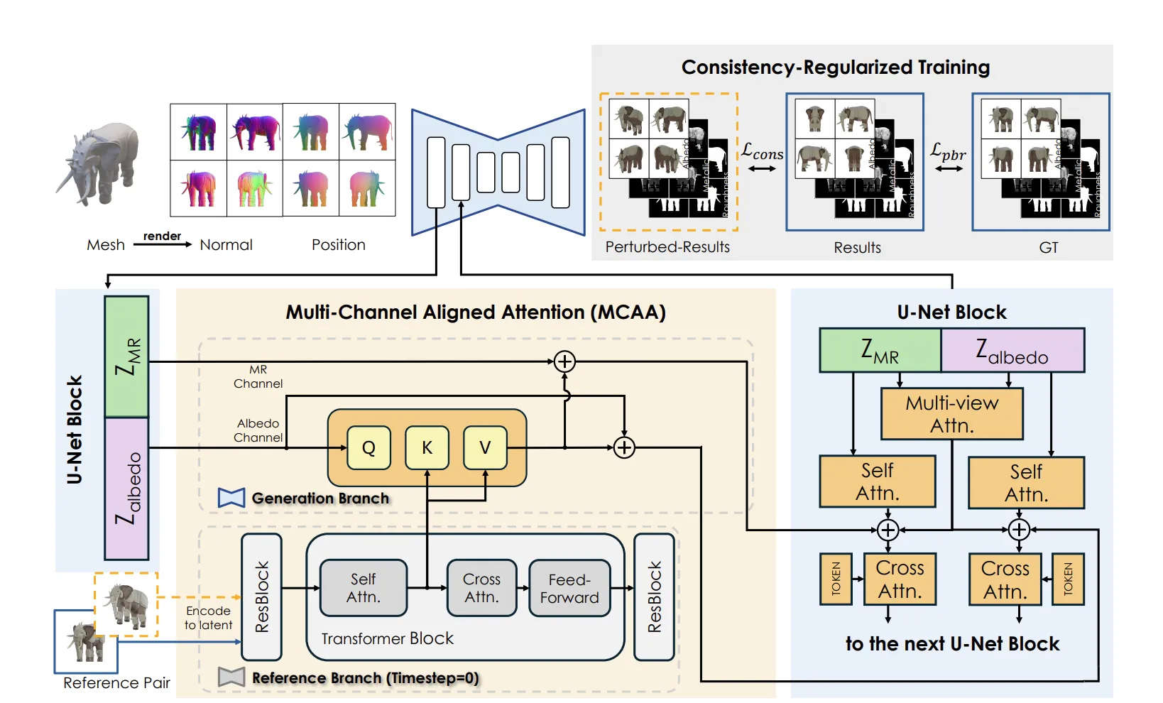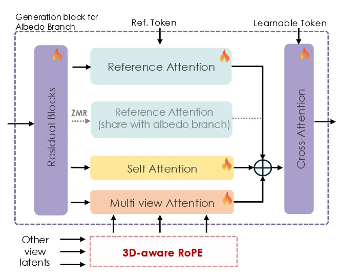 해당 그림이 동일한 저자인 tencent 회사에 낸 Materialmvp 방식이고 이 방식을 이용해서 multibranch unet을 생성했는데 논문을 안읽어서 자세히는 모르겠지만 맨 오른쪽에 learnable token 2개가 각각 MR과 albedo가 되어서 학습이 진행되는거 같습니다. 처음 UNet에 들어가는 입력이 latent + normal+ position인데 이게 아마도 encoder를 통해서 2개의 branch로 분기되도록 설계 되지 않았을까 추측합니다. (자세한 방법은Materialmvp 참고)