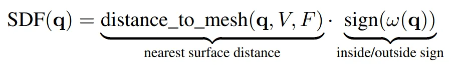 IGL은 위와 같이 진행되는데, 3D grid(격자) 형태로 데이터셋을 나눠서 SDF를 계산합니다. SDF는 위와 같이 2가지 절댓값과 부호로 나눠집니다. 절댓값은 mesh 표면까지의 최단거리로 해당 점이 mesh에서 멀어질수록 큰 값을 갖고, 부호는 winding number를 이용해서 mesh 내부이면 + 외부이면 -를 갖습니다. 참고로 위의 수식에서 V는 vertex, F는 face, q는 query로 격자에 해당하는 값입니다.