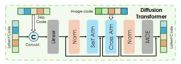 이 부분이 아마 가장 많이 바뀐 부분 같습니다. DiT의 각 block에서 latent code와 skip code를 cocnat하고 마지막 layer에 MOE를 추가합니다.