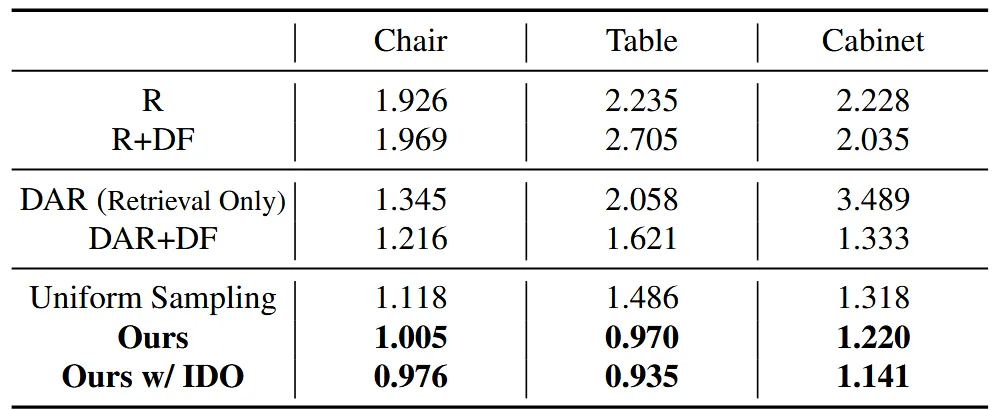 위에서 구한 Retrieval 확률을 가중치로 사용합니다. 확률이 높은 source일수록 실제 chamfer 오차를 더 크게 줄이도록 학습시키는 효과가 있습니다. 즉 주로 선택될 소스에 더 많은 학습 비중을 두는 것 입니다.