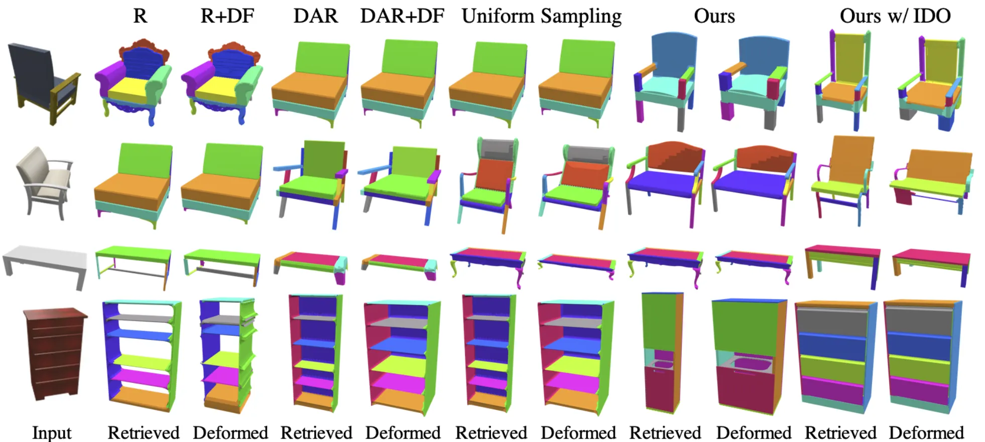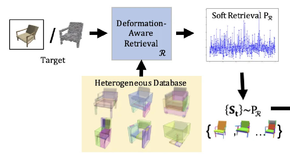 Source model에 대해서 Part을 얻는 과정을 먼저 진행합니다. 여기서 말하는 Part는 segmentation 결과라고 생각하시면 되는데, 그림에서 색깔로 구분되어 있는 각 부분들입니다. 예를들어서 의자면 등받침대, 팔걸이, 다리 이렇게 구분이 될 것입니다. Part를 수동적으로 얻을 때는 PartNet 방식을, 자동적으로 얻을 때는 ComplementMe 방식을 사용합니다.