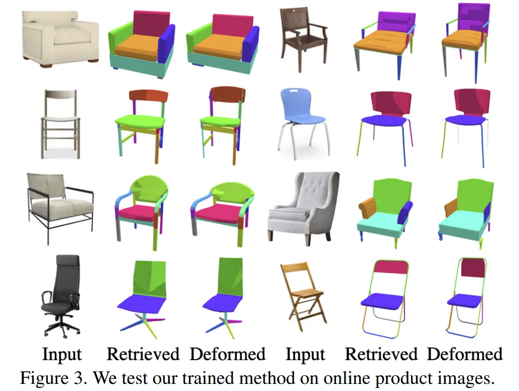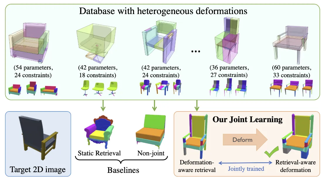 모델은 2D image와 유사하면서 Deformation하기 적합한 source 모델을 꺼내오는 Retreival 과정과 꺼내온 source 모델을 실제 타겟 형태에 맞게 변형하는 Deformation 과정을 joint learning 시키는 방식입니다.