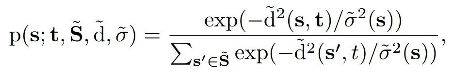 첫번째로 target(t)과 source model(s)의 임베딩을 계산합니다. 이후 soft retrieval 확률 계산 했던 방식으로 두 임베딩의 거리에 대해서 softmax를 취한 값을 얻습니다.