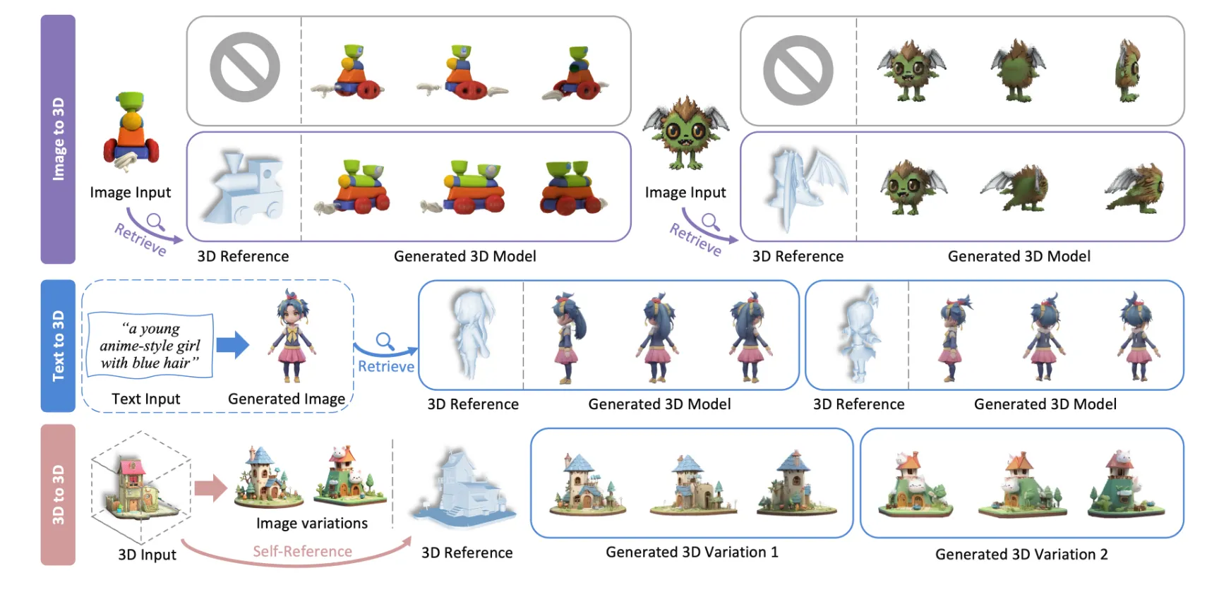 우리가 원하는 형태의 3D를 얻고싶을 때 Reference Shape을 기반으로 생성해서 더 좋은 퀄리티를 얻는 방식입니다. 위의 그림처럼 크게 Image, Text, 3D To 3D가 가능한거 같습니다.