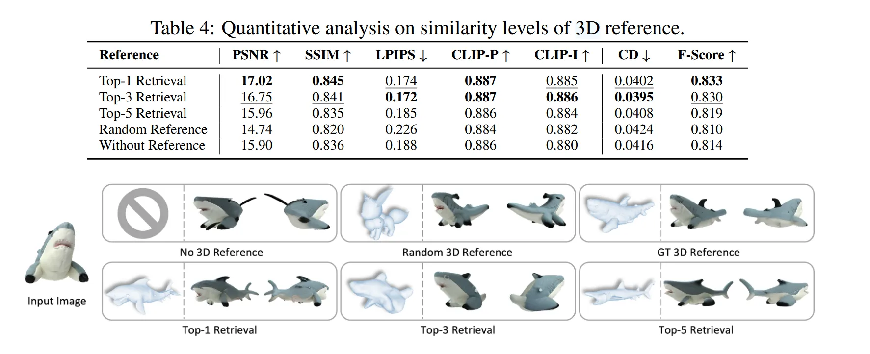 PHIDIAS는 reference 유사도에 매우 민감하며, 유사한 reference일수록 더 좋은 성능을 내고, 오히려 무관한 reference는 없는 것보다 나쁜 결과를 유도할 수 있습니다.