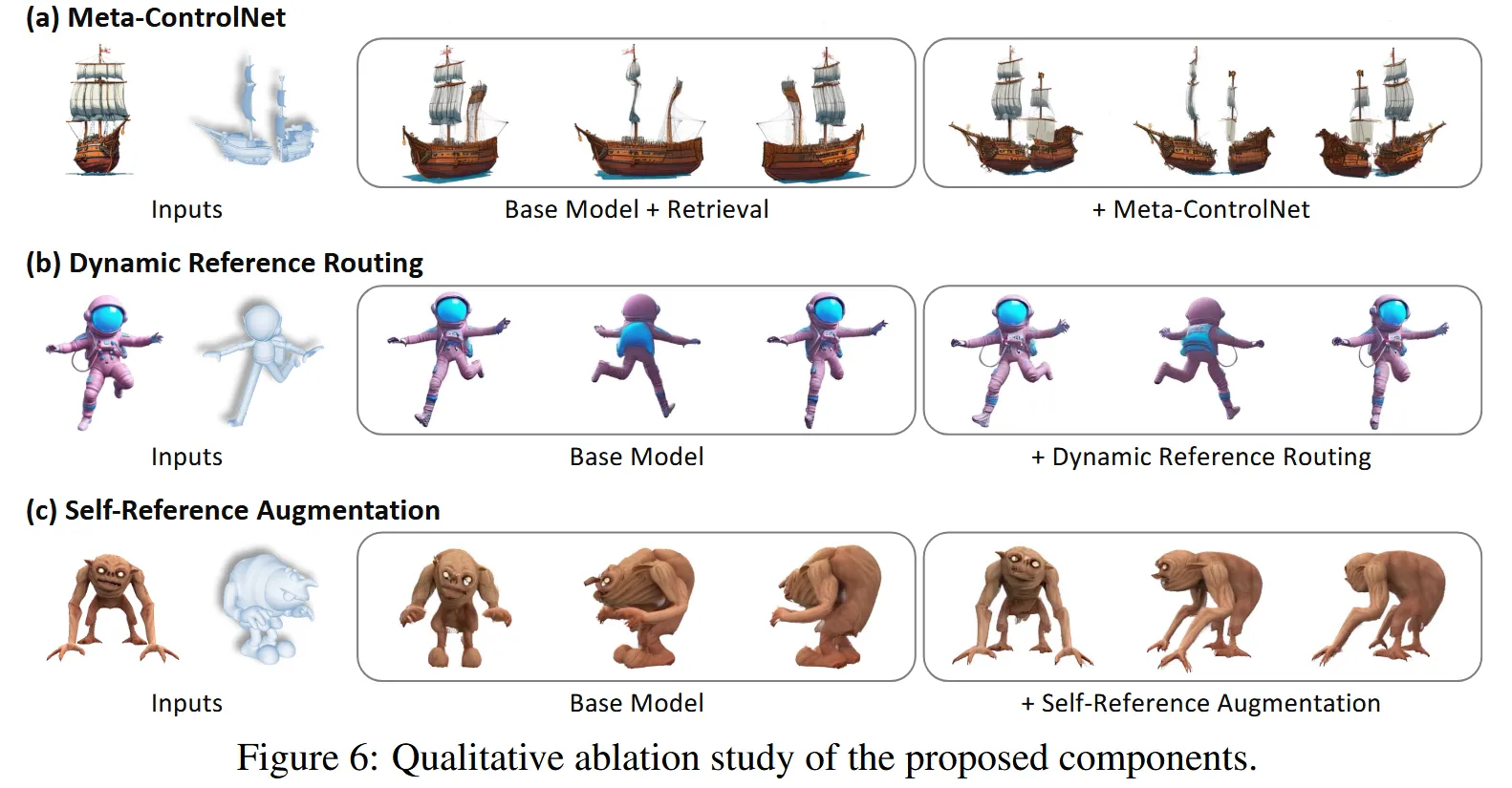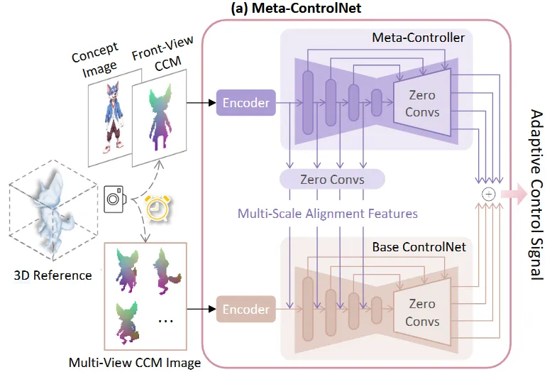 CCM으로만 guidance를 추가한 경우 3D reference가 input image와 정확하게 align 되지 않거나, local적으로 형태가 다를 수 있습니다. 이를 위해서 아래에 3가지 개념(Meta-ControlNet, Dynamic Reference Routing, Self-Reference Augmentation)를 제시했습니다.