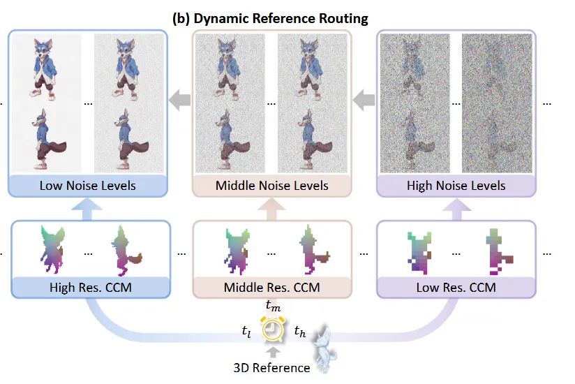 이전에도 말했지만, 3D reference는 우리가 원하는 결과와 대략적인 형태는 비슷하지만 texture와 같은 디테일한 부분은 다릅니다. 따라서 denoise timestep에서 reference의 resolution을 조절해주는 dynamic reference routing을 통해서 디테일한 부분을 참고해서 발생한 artifact를 제거하려고 합니다.