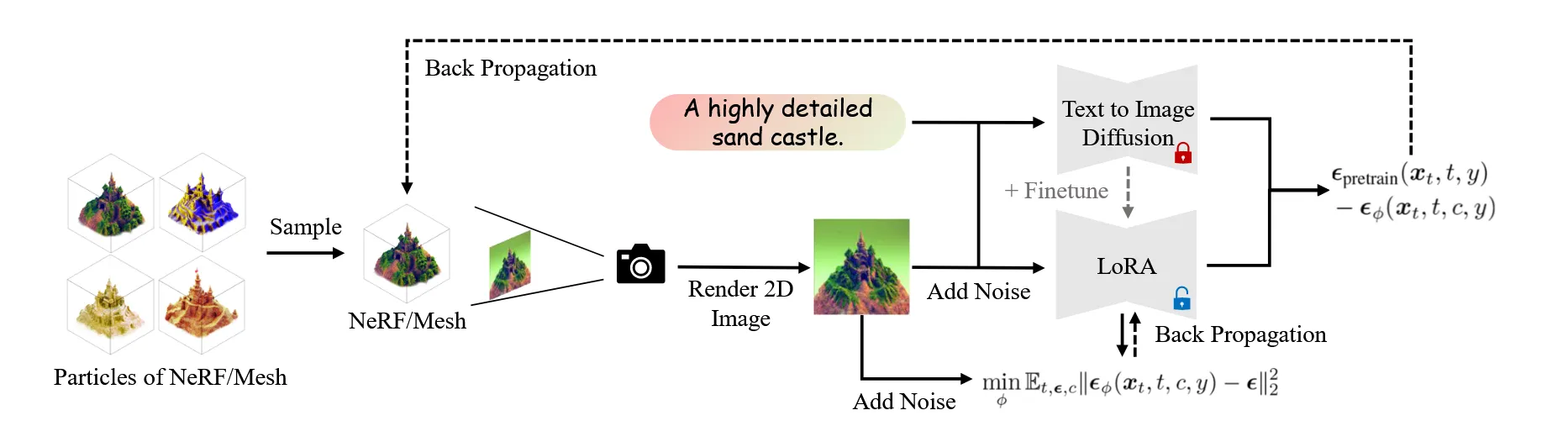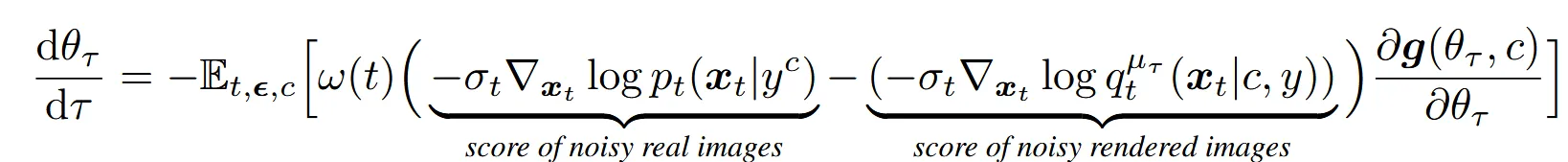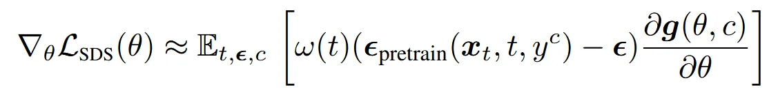 수식을 살펴보면 괄호안의 첫번째 항은 사전 학습된 diffusion model을 통한 결과, 두번째 항은 렌더링된 이미지의 결과입니다. 두 차이를 기반으로 가중치가 업데이트 되는 것을 알 수 있습니다.