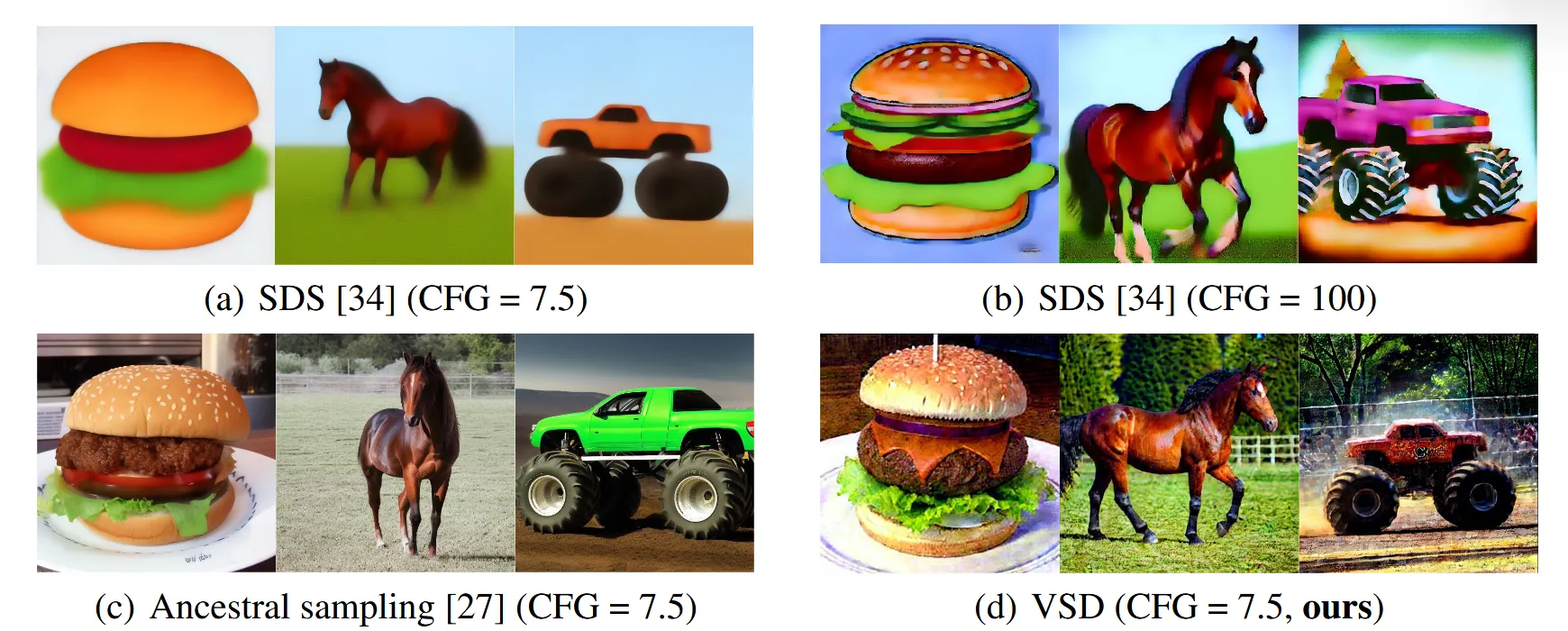 VSD에서 CFG 값을 매우 유연하게 조절할 수 있습니다. 이에 text-to-image에서 일반적으로 가장 높은 성능을 내는 7.5로 설정을 했습니다. 하지만 SDS에서는 단일 파라미터만 업데이트를 진행하기 때문에 정교화된 업데이트가 필요해 CFG 값을 100으로 설정했습니다. CFG값이 클수록 텍스트 프롬프트와 더 잘 맞아떨어지지만, 그만큼 다양성이 줄어들 수 있습니다.