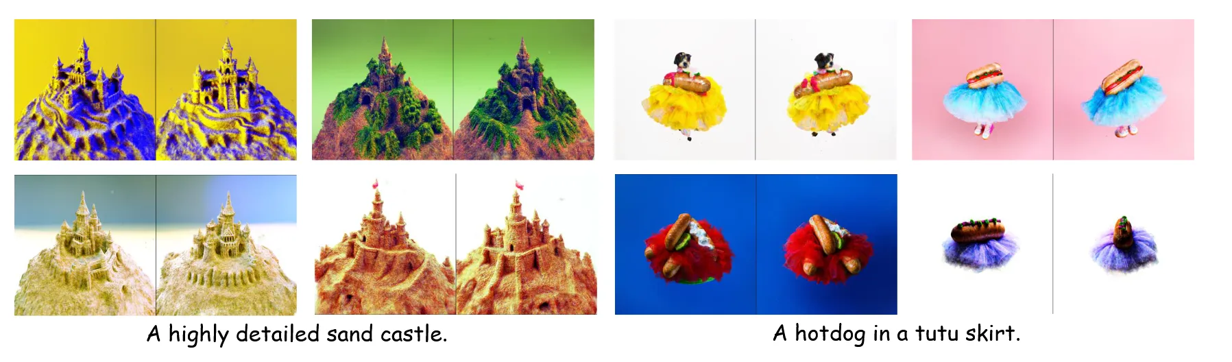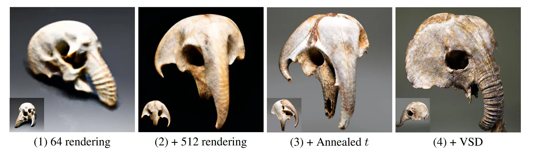 기본적인 세팅인 64해상도 SDS 방법에서, 512 해상도, Annealed 방식의 추가, VSD 방식의 추가를 나타낸 그림입니다.