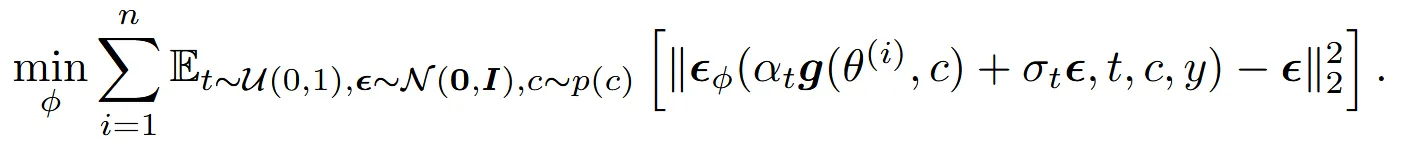 사전 학습된 노이즈 예측 모델과 현재 학습 중인 노이즈 예측 모델 간의 차이를 줄이기 위해, 3D 파라미터 𝜃가 어떻게 업데이트되어야 하는지를 설명하는 수식