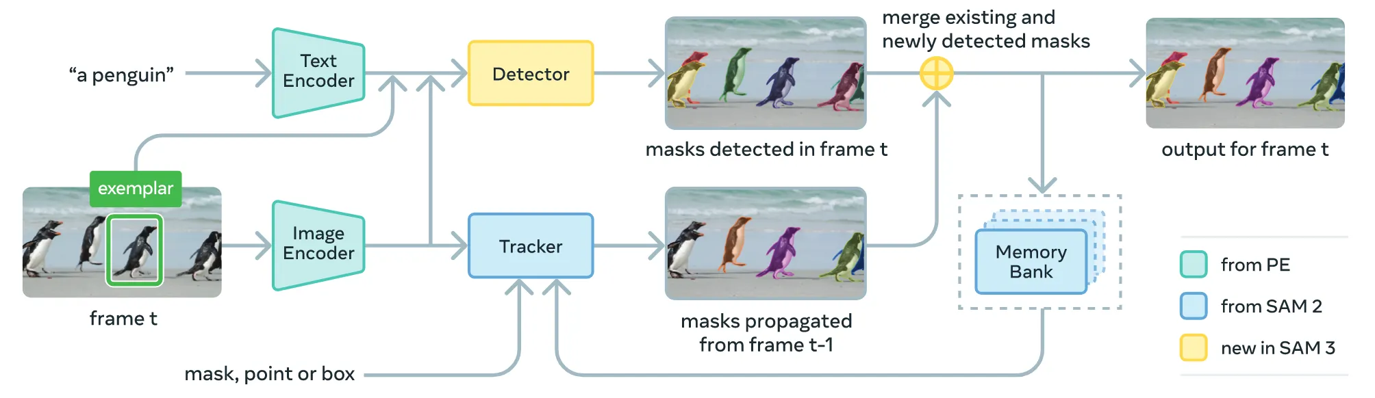 Tracker는 SAM2 모델을 이용했고 detector와 동일한 image/frame encoder를 사용합니다. Detector를 우선 학습한 뒤 PE backbone만을 freeze시키고 prompt encoder, mask decoder, memory encoder, and a memory bank를 포함해서 tracker를 학습시킵니다. Memorey encoder는 이전 프레임에 대한 정보를 저장하는 모델로 transformer 형태의 아키텍처로 현재 프레임과 이전 프레임의 정보를 cross-attention를 기반으로 정보를 공유하는 방식으로 설계 되어있습니다. 자세한 내용은 appendix(C.3)를 참고하시면 됩니다.