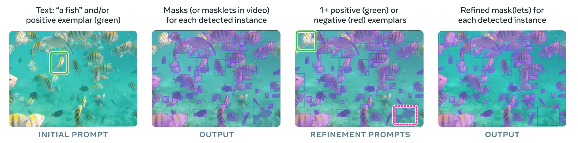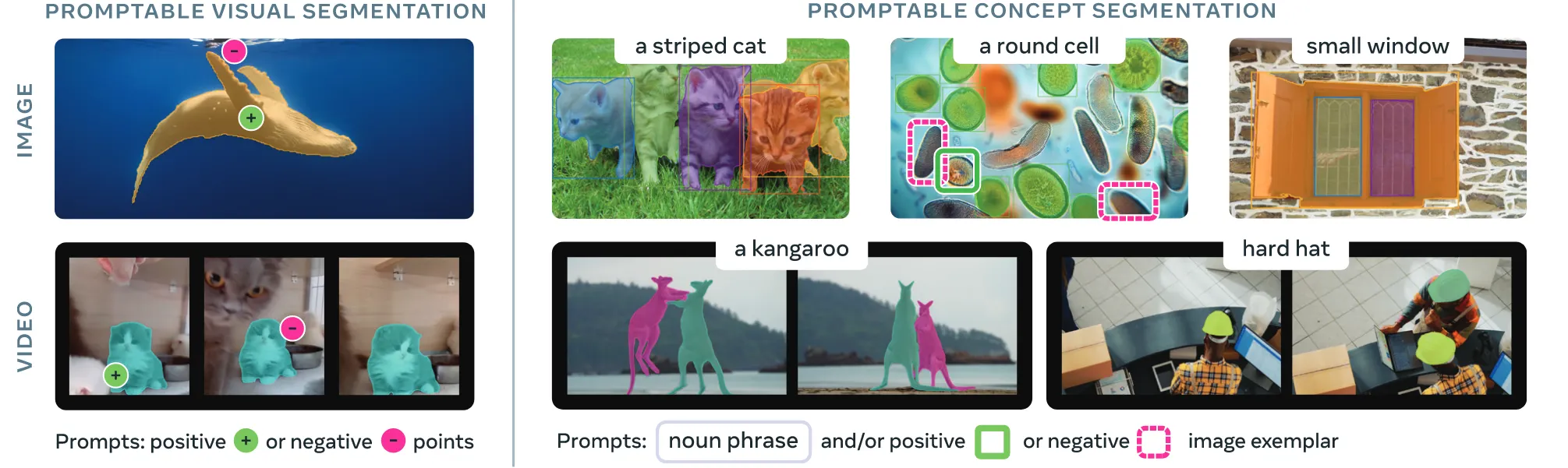 하나의 이미지나 30초보다 작은 길이의 짧은 비디오가 들어오고, 해당 입력에서 detect나 segment하고 싶은 부분에 대해서 text나 positive exempler(왼쪽에 초록색 박스)를 넣으면 condition에 맞는 모든 객체를 detect나 segment하는 방식이 Promptable Concept Segmentation(PCS)입니다.