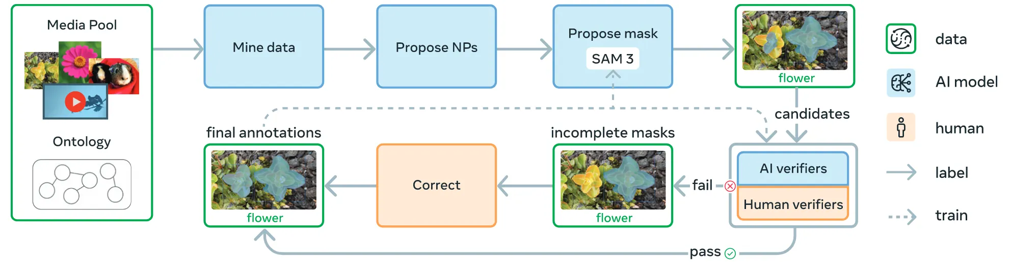 SAM3를 학습하기 위한 데이터를 구축하기 위해서 SAM3가 잘 해결하지 못하는 데이터를 만들고, 해당 부분을 다시 학습시키는 과정을 반복합니다. AI가 1차로 annotation을 하고, 어려운 문제들만 사람이 직접하는 형식을 사용했습니다. 초기에는 이미지들을 기반으로 학습하고 마지막에 비디오로 확장하는 방식입니다. 자세한 내용은 Appendix D에 나와있습니다.