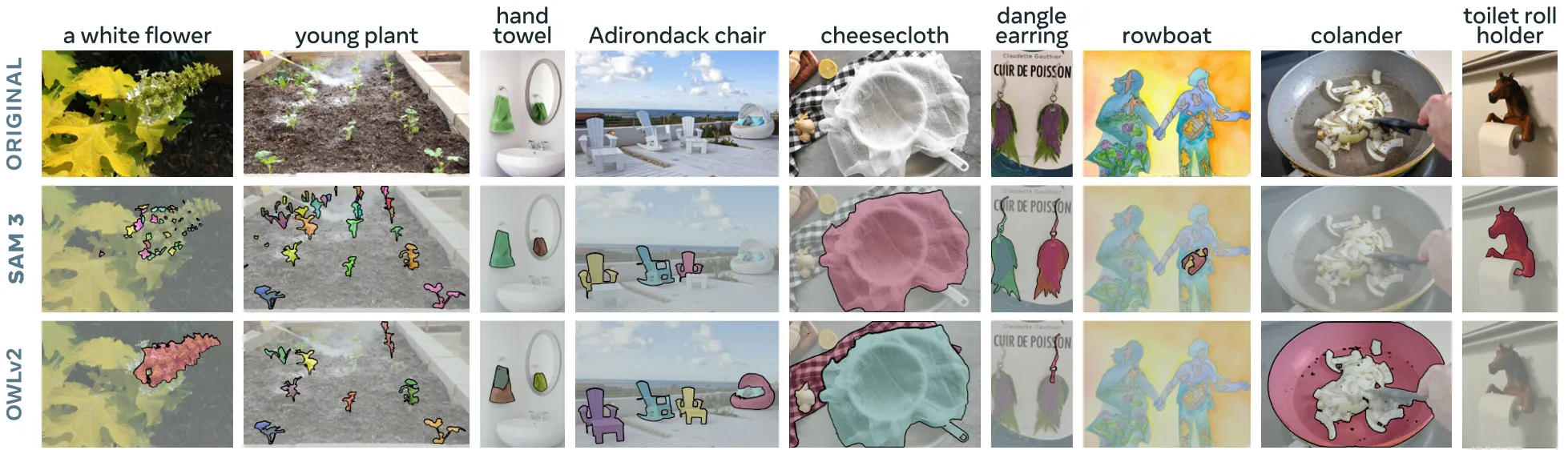 또한, SAM 3는 Open-Vocabulary 환경에서도 기존 모델보다 훨씬 정밀한 마스크 생성, 작은 객체 탐지, 그리고 희귀한 개념 처리 능력을 보여주며 확실한 성능 향상을 입증했습니다.