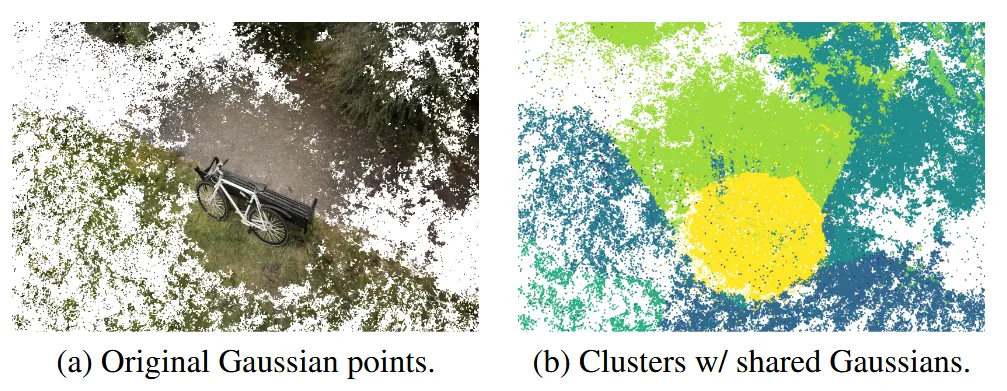 Shared Gaussian은 모든 시점에서 보이는 부분으로 위의 그림에서 왼쪽에서는 자전거 부분, 오른쪽에서는 노란색 영역이 될 것입니다. Exclusive Gaussian은 특정 시점에서만 보이는 부분으로 나머지 영역과 색깔에 해당된다고 보시면 됩니다. 오른쪽 그림에서 시점에 따라서 다른 색깔로 구분해둔 것을 알 수 있습니다.