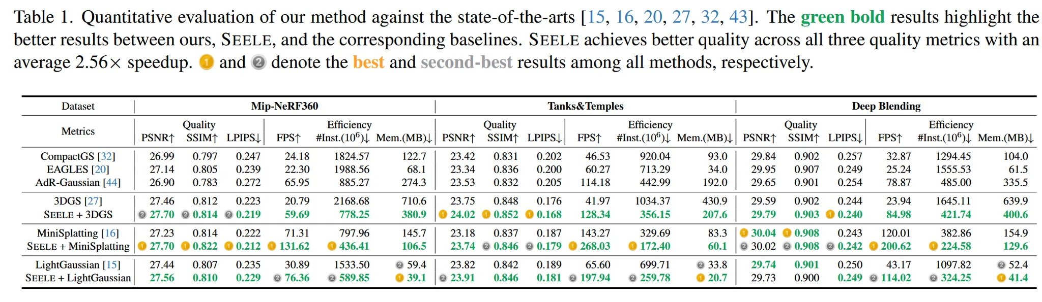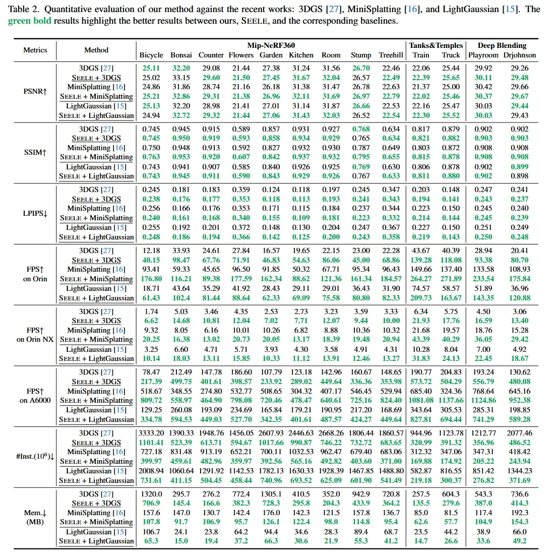 여러 3D GS를 사용하는 모델들과 위에서 말한 3가지 데이터셋의 성능을 비교한 결과입니다. 전반적으로 SEELE 모델이 PSNR과 SSIM 그리고 LPIPS 결과가 개선된 것을 확인할 수 있습니다.
