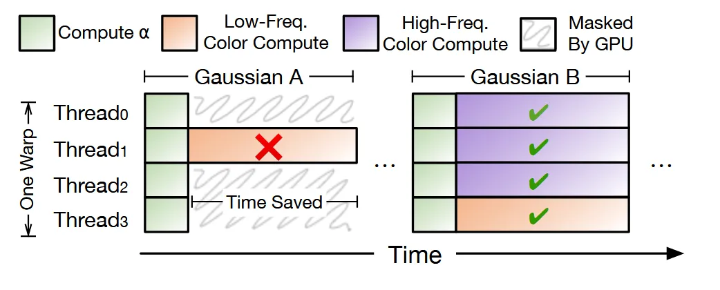 이러한 기다림을 방지하기 위해서 1개의 gaussian 안의 Wrap들을 모두 동일한 그룹으로 속하게 시킨 후 , Thread0번을 리더 픽셀로 선택해서 임계치를 넘으면 모든 Wrap들이 이후 연산을 진행, 임계치를 넘지 않으면 모든 Wrap들이 연산을 진행하지 않는 방식으로 작동합니다.