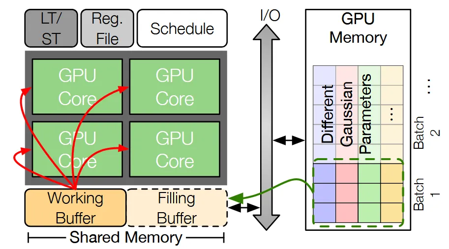 Shared Memory를 효율적으로 사용하면 시간을 단축할 수 있기 때문에 논문에서는 효율적인 Shared Memory 사용을 위해서 Double Buffering 방식을 사용했습니다. Working Buffer 부분에서는 현재 배치에서 사용하는 데이터를 저장, Filling Buffer에서는 다음 배치에서 사용할 버퍼를 저장합니다. 이렇게 될 경우 데이터를 불러올 때 드는 시간을 단축시킬 수 있습니다.