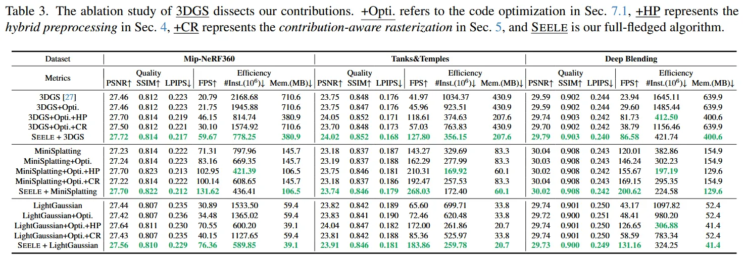 평균 2.8x 정도의 전체 속도 향상을 이뤘습니다. 모델 크기와 메모리도 불필요한 gaussian을 제거했기 때문에 32.3% 감소 했습니다.