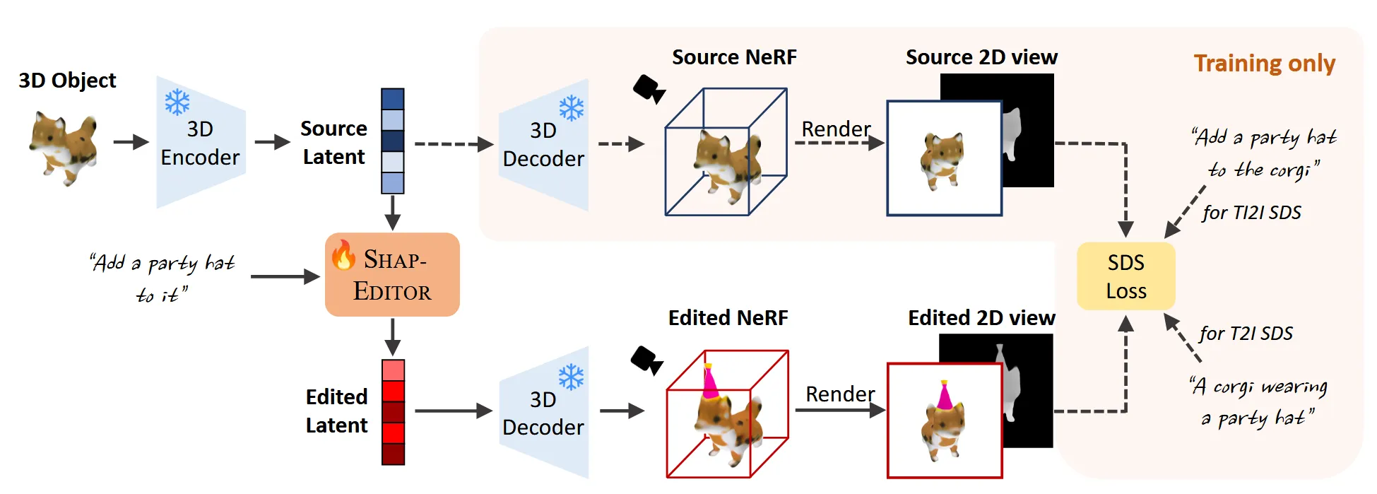 3D object를 latent로 변환하기 위해 새로 학습된 모델이 아니라, 사전학습된 off-the-shelf 모델인 Shap-E를 사용했습니다. Shap-E는 3D 오브젝트를 latent로 인코딩하는 auto-encoder 구조를 포함하고 있으며, 해당 latent는 다시 디코더를 통해 3D 오브젝트로 복원할 수 있습니다. 또한, Shap-E는 텍스트나 이미지 조건을 기반으로 latent를 샘플링할 수 있는 diffusion 기반 생성기도 포함하고 있으며, SHAP-EDITOR에서는 주로 이 모델의 Encoder와 Decoder를 사용하여 3D ↔ latent 변환에 활용합니다.