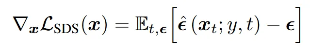 이후에는 아래와 같은 SDS 기반 loss를 사용해, 2D 이미지 상에서 text prompt에 따라 latent를 업데이트하는 방법을 학습합니다: