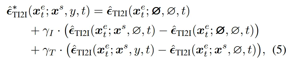수식을 보면 기존에 추가적인 term 하나만 더 붙은 것을 확인할 수 있습니다. 이때는 guidance_scale이 총 3개인데 이미지, 텍스트, 전체적인 텍스트(방금 설명한 내용) scale은 각각 (2.5, 7.5, 50)으로 전체적인 텍스트의 중요도가 상당히 높은 것을 알 수 있습니다.