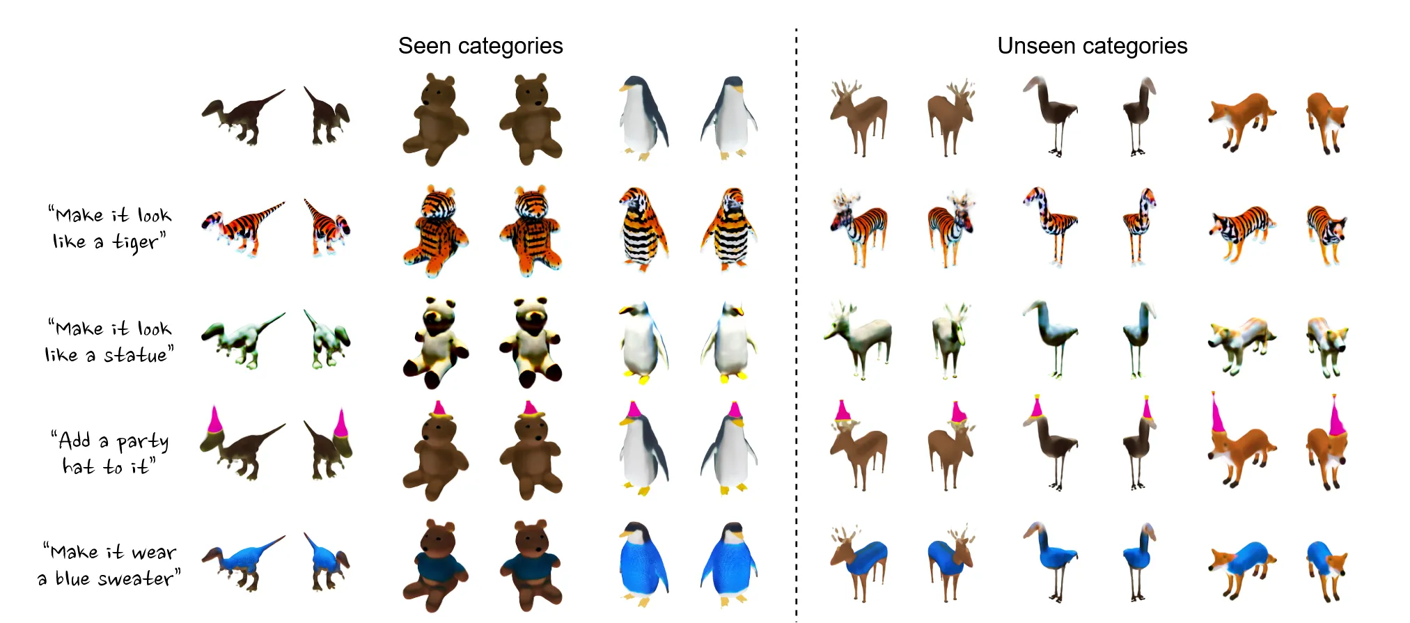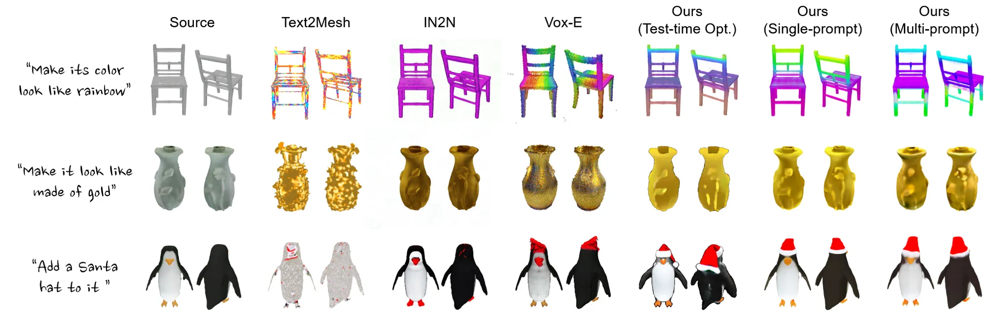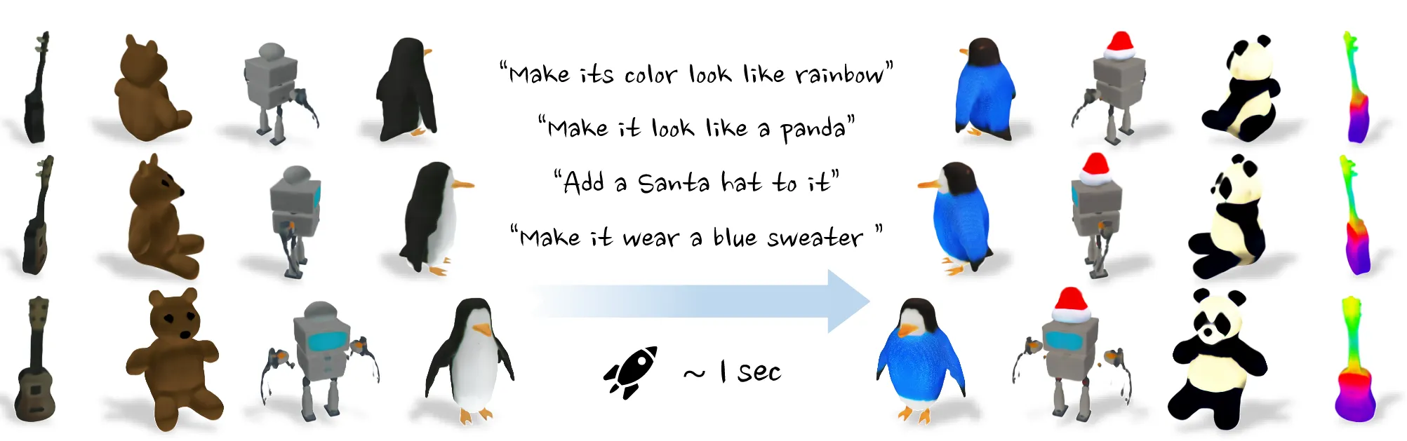 마지막으로 latent 상에서 text prompt y를 기반으로 편집하는 함수를 사용하면 됩니다. 이를 통해 빠르고 간결하게 text prompt를 3D object에 반영할 수 있습니다.