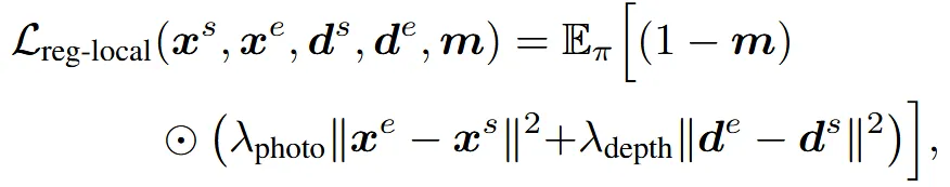 이후 위의 수식과 같이, mask m에 해당되지 않는 영역 (1−m)이 원본과 유사하게 유지되도록 photometric 및 depth 기반 정규화 손실을 추가합니다.