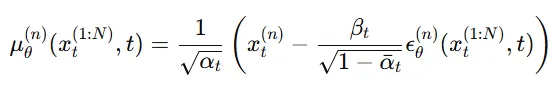 Forward Process: 수식을 오른쪽부터 확인하면 1부터 N까지의 이미지에 대해서 T시점까지 noise를 더하는 과정인 것을 확인할 수 있습니다. 가운데 수식은 1부터 N까지의 이미지를 윗첨자로 (1:N)으로 나타낸 것이고, 맨 왼쪽 수식은 time step도 아래첨자로 1:T로 단순화 해서 나타낸 것입니다.