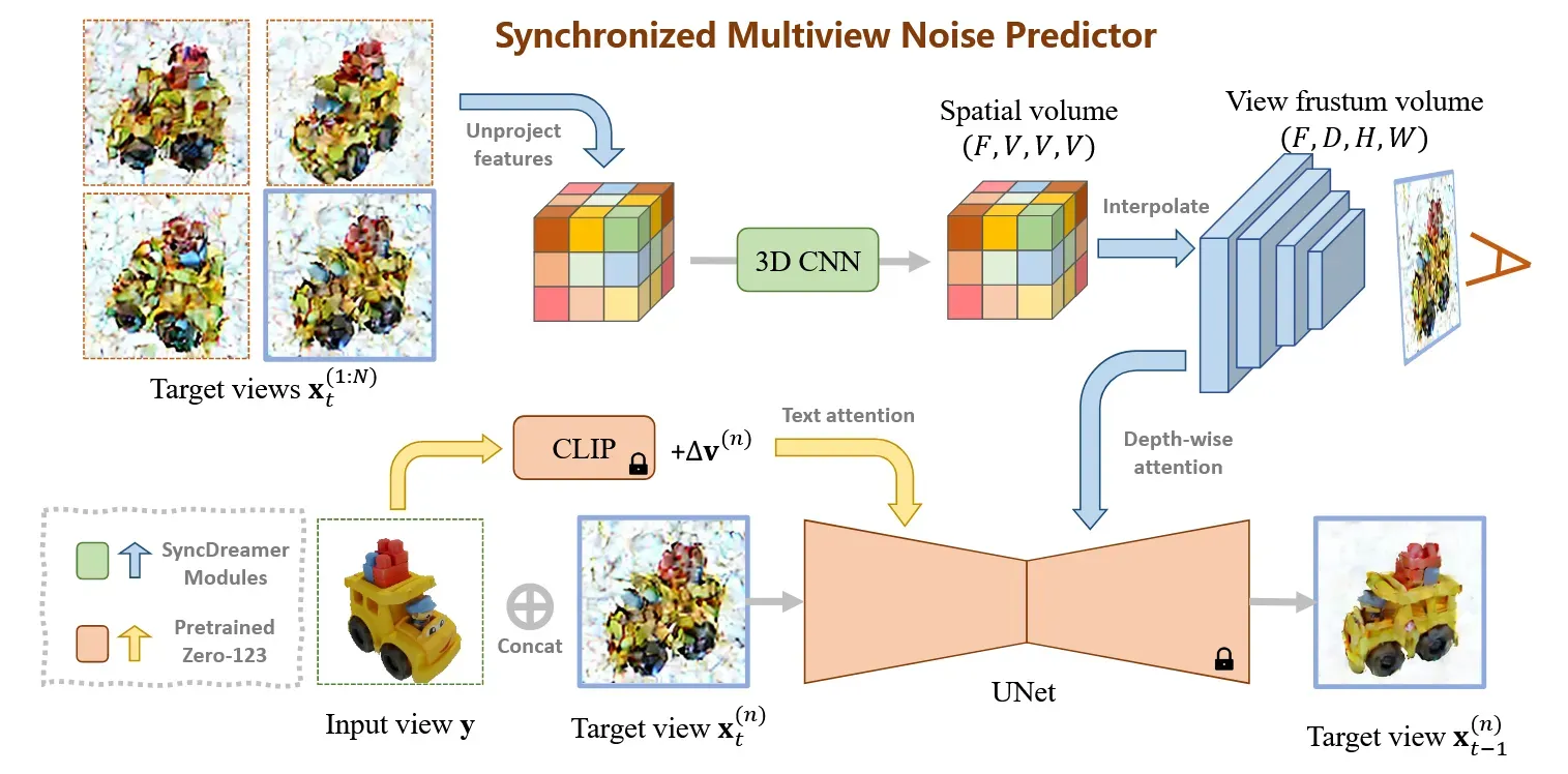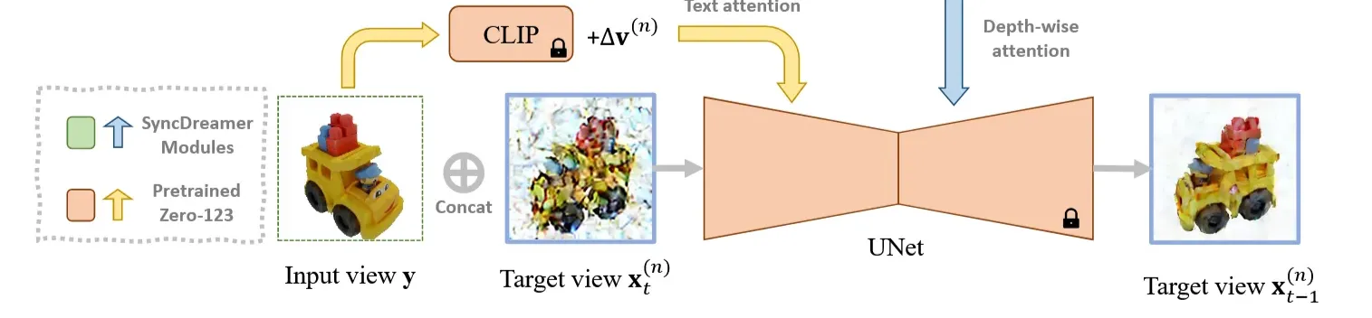 Noise를 제거하는 UNet 모델은 Zero123의 가중치를 기반으로 사용했습니다. 아래 부분을 보시면 Zero123랑 동일하게 작동합니다. 입력이미지와 noisy target view 이미지를 concat해서 UNet의 입력으로 사용합니다. Viewpoint difference()을 encode시켜서 입력 이미지(y)를 CLIP 임베딩을 통과한 결과와 concat해서 diffusion의 text attention layer에 넣습니다.